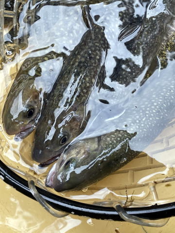 | 季節がすすみ 昨日の美濃地方の最高気温は28.2℃と岐阜一番で、 日中の日差しがきつく感じられました。 それでも朝は少し冷え込む事もあるので調整のきく服装でお越しください。 当店はポンドとストリーム両方楽しんでいただける管理釣り場です。 ポンドは現在放流している魚種はニジマスだけです。 冷たい水を好むイワナは水温が上昇したので放流いたしません。 (イワナを釣りたい方はストリームにチャレンジしてください) マスはポンド全体に散っていますので 浅いインレットでも十分釣りになります。 ルアーフィッシングもタックルのバランスがとても大事です。 海で使うロッド、バスロッドは硬すぎて全く不向きです。 またロッド、リールは良いけどラインが太い方がみえます。 当店は水の透明度が高いので太いライン(4ポンド以上)は魚に見切られてダメな事が多いです。 出来れば2.5ポンドの透明なラインが良いです。 当店のルアーのレンタルタックルは3ポンドで組んでいます。 ストリームは現在増水5cm程と良い水量です。 ![]() ストリームは現在、ニジマス主体にアマゴ、イワナを放流しています。 アマゴ、イワナはやっぱり早朝が良くキビキビ動くミノーに反応が良いです。 毛ばりの方は水量が少々多かったせいか? 浮くドライより沈めるタイプにヒットし易かったです。 岸からアプローチ出来るポイントもありますが、 全域やりたい方はウェーダーが必要です。 何より安全にやっていただけると思います。 レンタルウェーダーもございます。 放流エサ釣りはニジマスの食いがとても良いので 初心者の方、お子様でも楽しんで頂けます。 アマゴの稚魚は順調ですが、イワナの稚魚には毎年苦戦しています。 ![]() ![]() イワナ稚魚2cm 食い過ぎやろ!